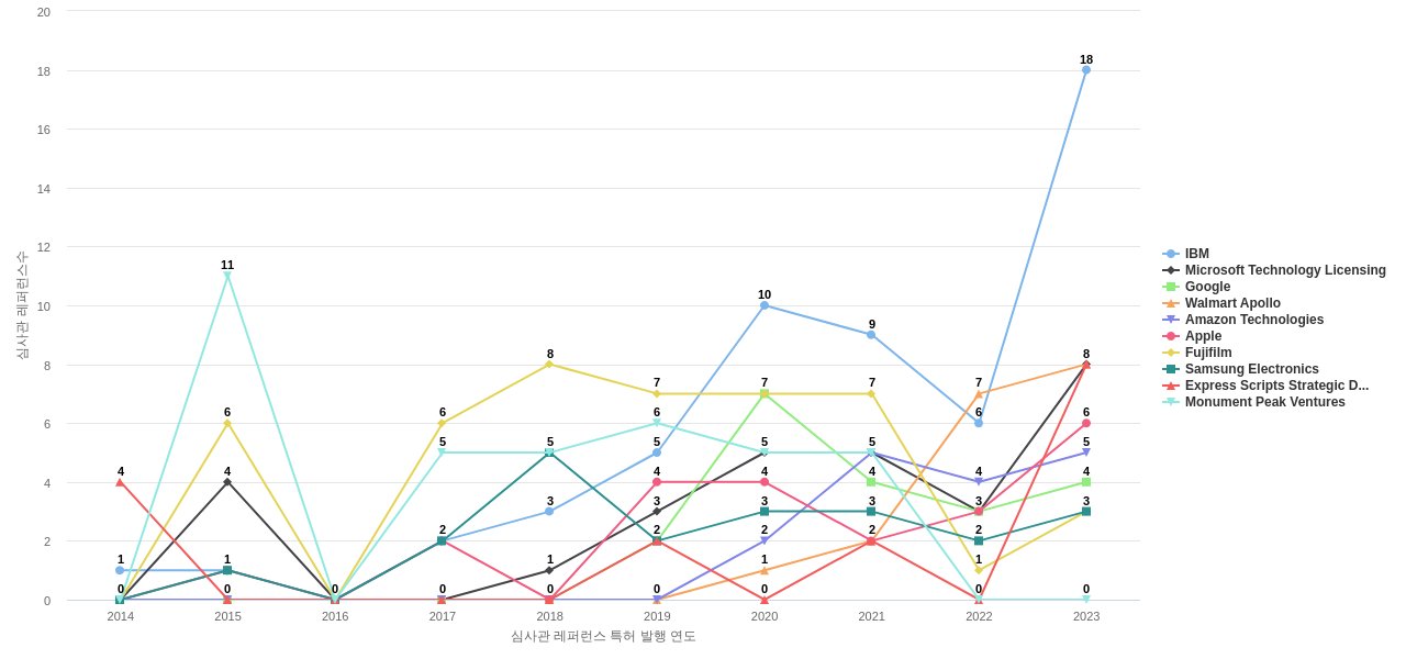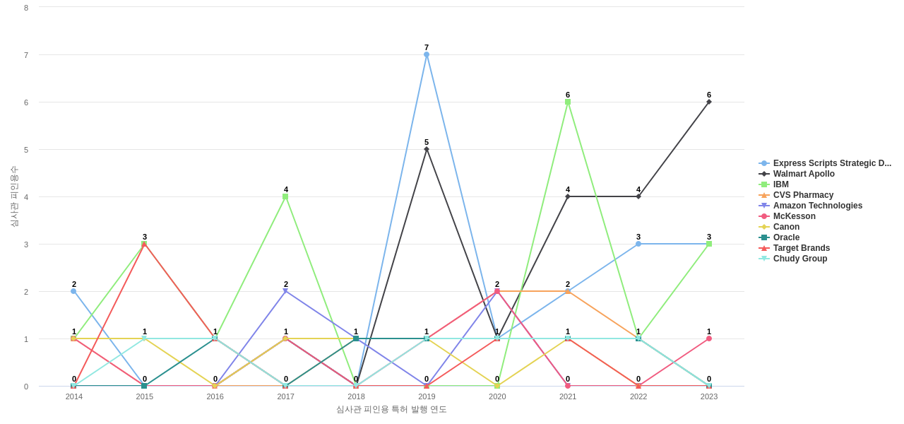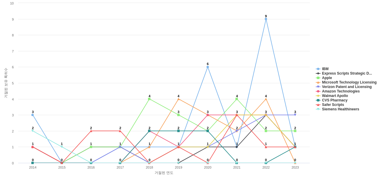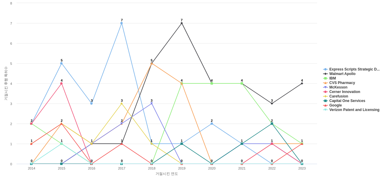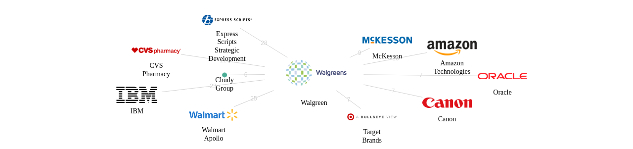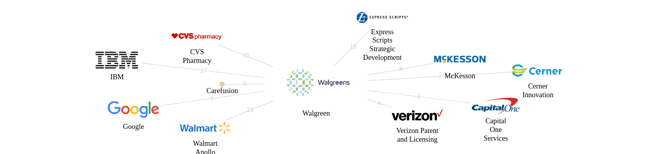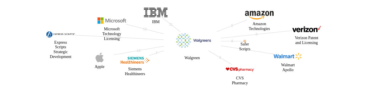 이 기업 보유 선행 특허가 받은 심사관 피인용수가 많은 관련 기업에는 1위 Express Scripts Strategic Development(28회), 2위 Walmart Apollo(25회), 3위 IBM(23회) 등이 있습니다.
