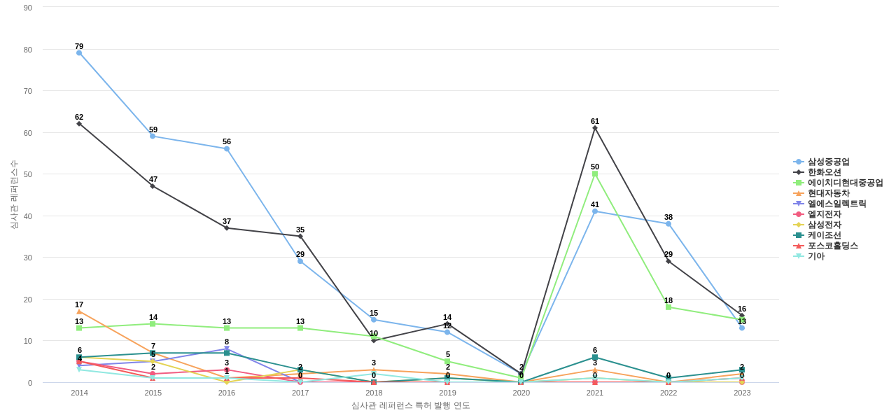 한화오션의 심사관 피인용수는 663회입니다. 한화오션의 심사관 피인용수는 11년 이전부터 발생하기 시작하여 2015년에 89회의 최고값을 보입니다. 그리고, 이 값은 이번 연도인 2024년에는 43회, 1년 전인 2023년에는 83회, 2년 전인 2022년에는 81회를 보입니다.