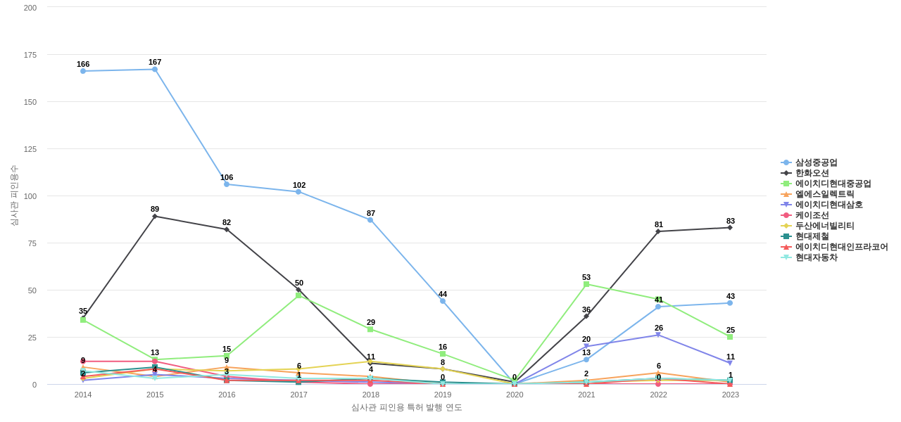 삼성중공업의 심사관 피인용수는 1,087회입니다. 삼성중공업의 심사관 피인용수는 최근 11년 이전에 294회, 최근 11년 동안에는 793회로 총 1,087회를 보이며, 2015년에 167회의 최고값을 보입니다. 그리고, 이 값은 이번 연도인 2024년에는 24회, 1년 전인 2023년에는 43회, 2년 전인 2022년에는 41회를 보입니다.