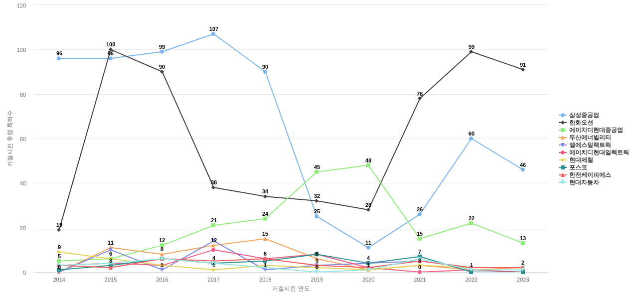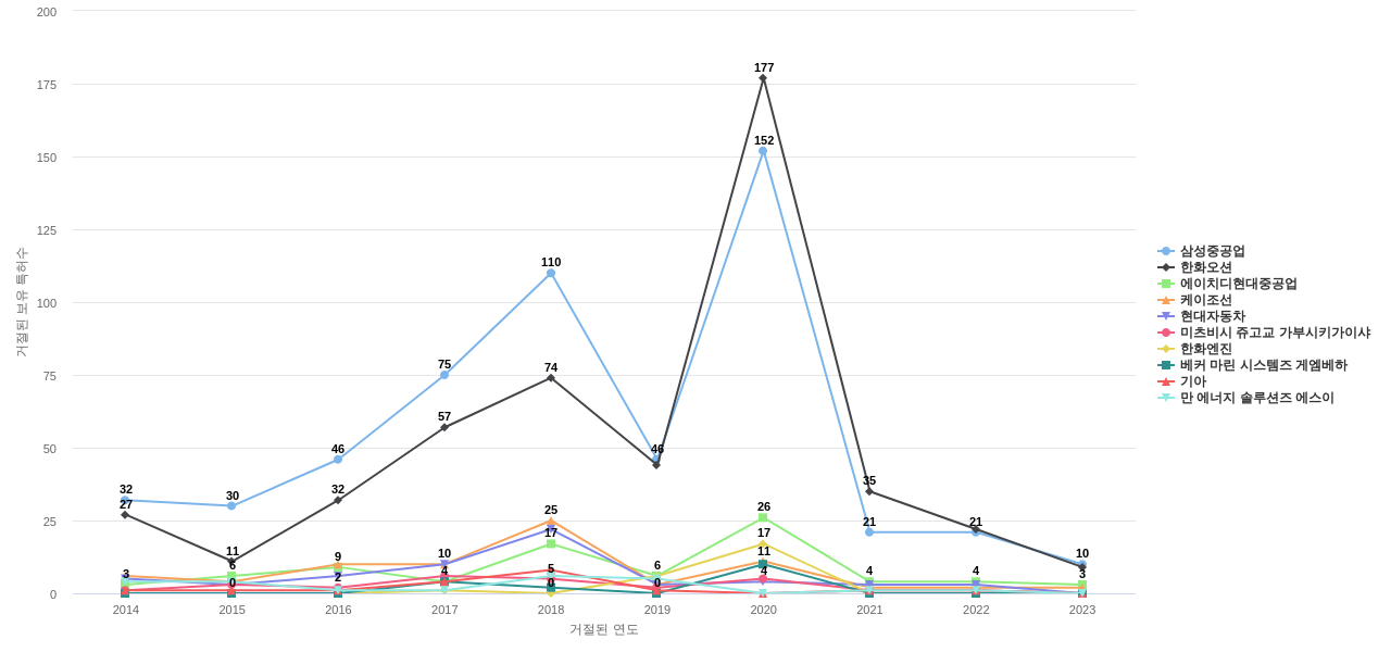 이 기업 보유 선행 특허가 받은 심사관 피인용수가 많은 관련 기업에는 1위 삼성중공업(1,087회), 2위 한화오션(663회), 3위 에이치디현대중공업(327회) 등이 있습니다.