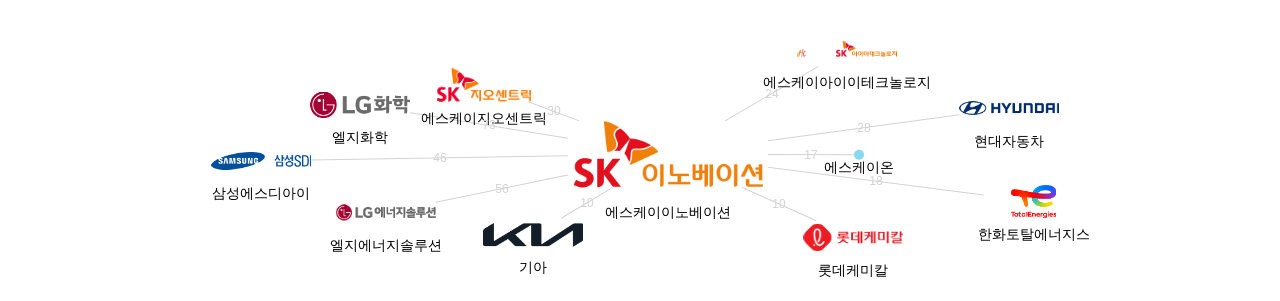이 기업 보유 선행 특허가 받은 심사관 피인용수가 많은 관련 기업에는 1위 엘지화학(73회), 2위 엘지에너지솔루션(56회), 3위 삼성에스디아이(46회) 등이 있습니다.
