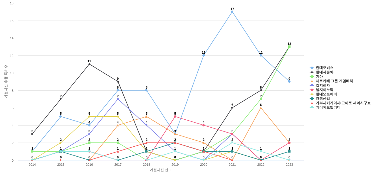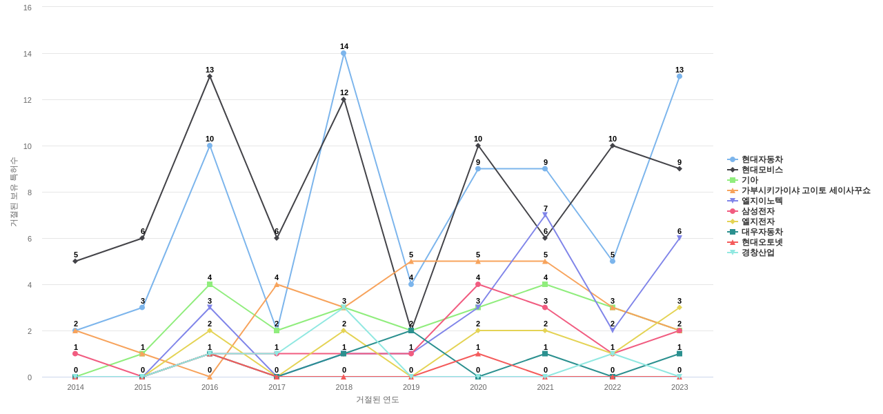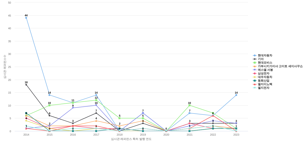 이 기업 보유 선행 특허가 받은 심사관 피인용수가 많은 관련 기업에는 1위 현대자동차(134회), 2위 현대모비스(78회), 3위 기아(51회) 등이 있습니다.