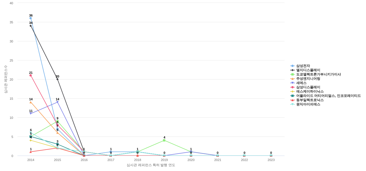 삼성전자의 심사관 레퍼런스수는 267회입니다. 삼성전자의 심사관 레퍼런스수는 최근 11년 이전에 229회, 최근 11년 동안에는 45회로 총 267회를 보이며, 2014년에 36회의 최고값을 보입니다. 그리고, 이 값은 이번 연도인 2024년에는 0회, 1년 전인 2023년에는 0회, 2년 전인 2022년에는 0회를 보입니다.