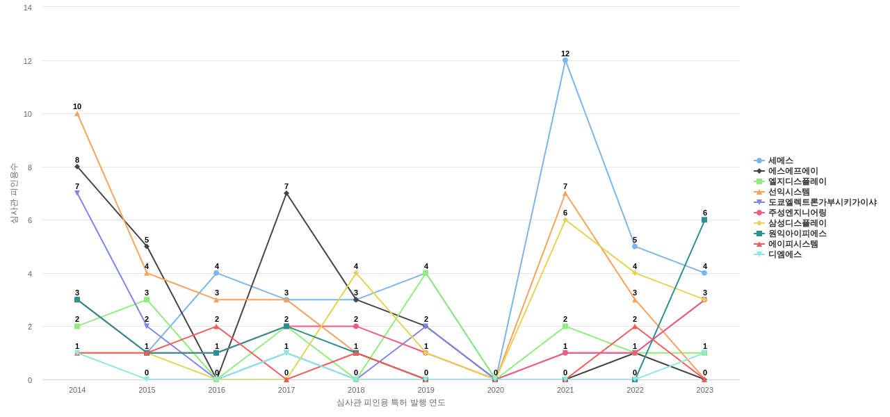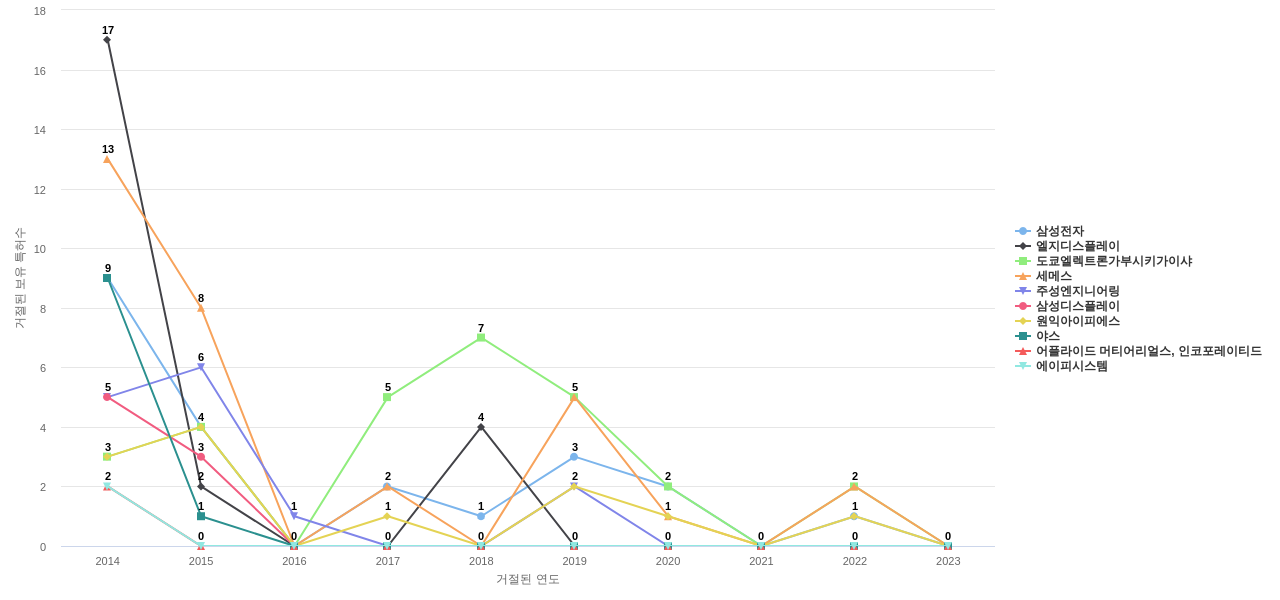 엘지디스플레이의 심사관 레퍼런스수는 144회입니다. 엘지디스플레이의 심사관 레퍼런스수는 최근 11년 이전에 107회, 최근 11년 동안에는 55회로 총 144회를 보이며, 2014년에 34회의 최고값을 보입니다. 그리고, 이 값은 이번 연도인 2024년에는 0회, 1년 전인 2023년에는 0회, 2년 전인 2022년에는 0회를 보입니다.
