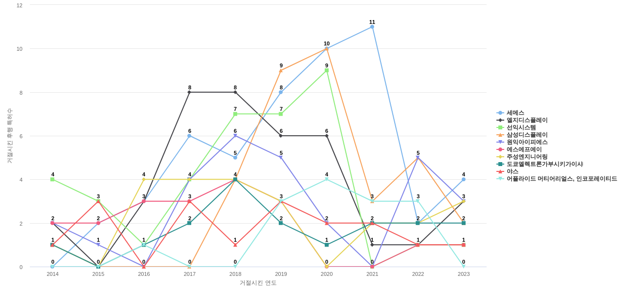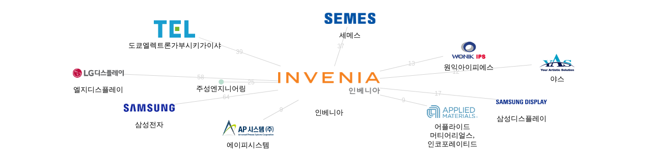 이 기업 보유 후행 특허가 참조하는 심사관 레퍼런스수가 많은 관련 기업에는 1위 삼성전자(267회), 2위 엘지디스플레이(144회), 3위 도쿄엘렉트론가부시키가이샤(96회) 등이 있습니다.