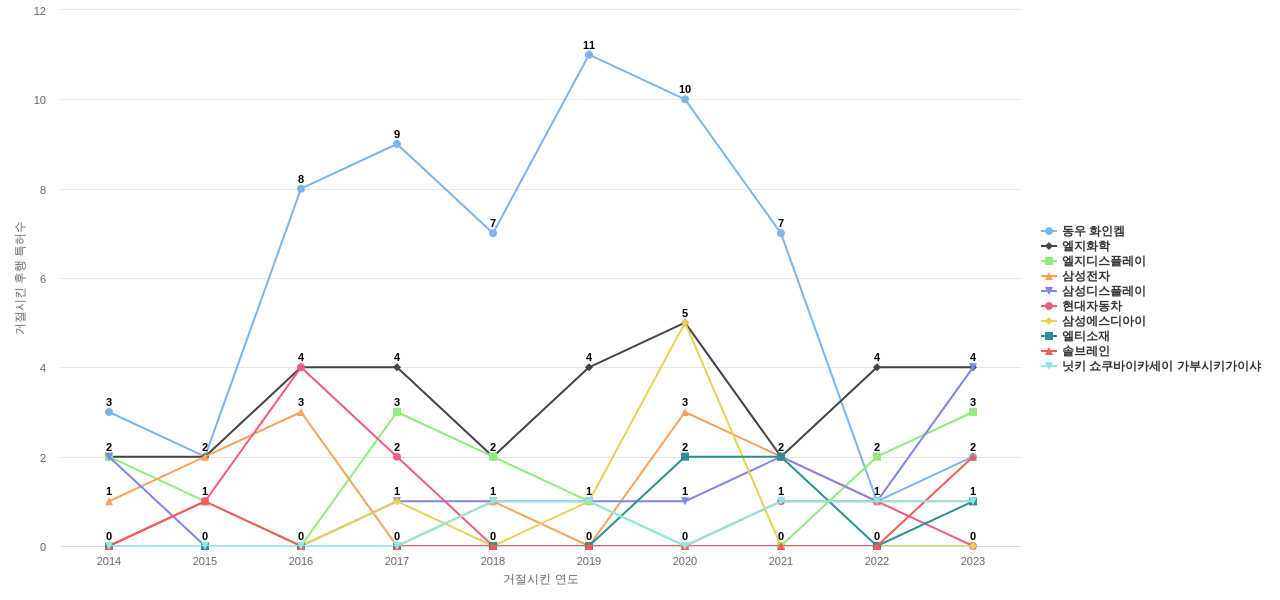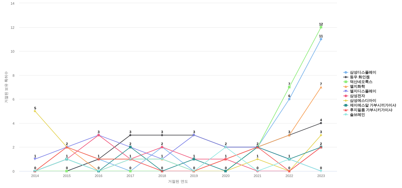 이 기업 보유 선행 특허가 받은 심사관 피인용수가 많은 관련 기업에는 1위 삼성디스플레이(74회), 2위 동우 화인켐(67회), 3위 엘지화학(48회) 등이 있습니다.