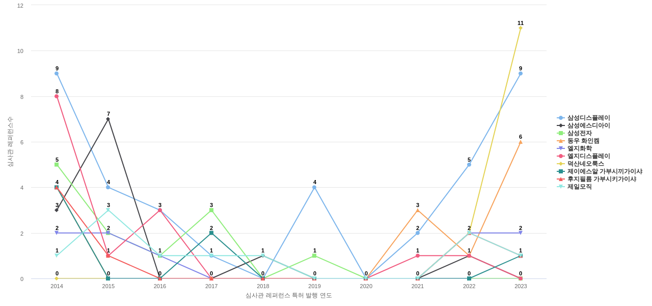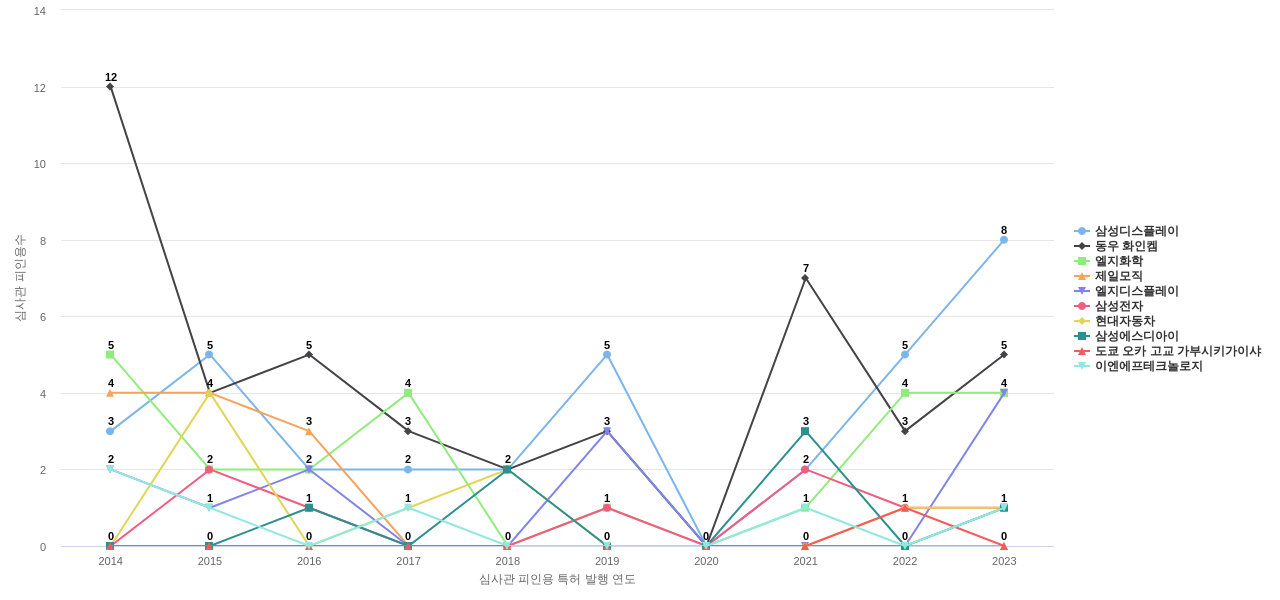 삼성디스플레이의 심사관 피인용수는 74회입니다. 삼성디스플레이의 심사관 피인용수는 최근 11년 이전에 30회, 최근 11년 동안에는 44회로 총 74회를 보이며, 2024년에 10회의 최고값을 보입니다. 그리고, 이 값은 이번 연도인 2024년에는 10회, 1년 전인 2023년에는 8회, 2년 전인 2022년에는 5회를 보입니다.