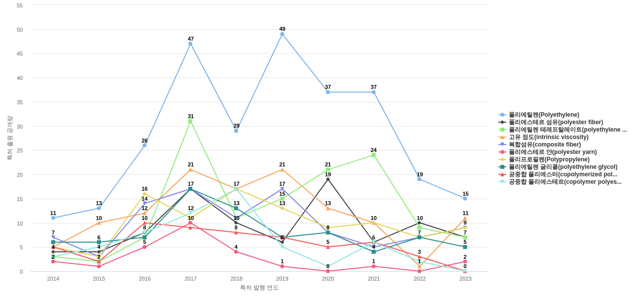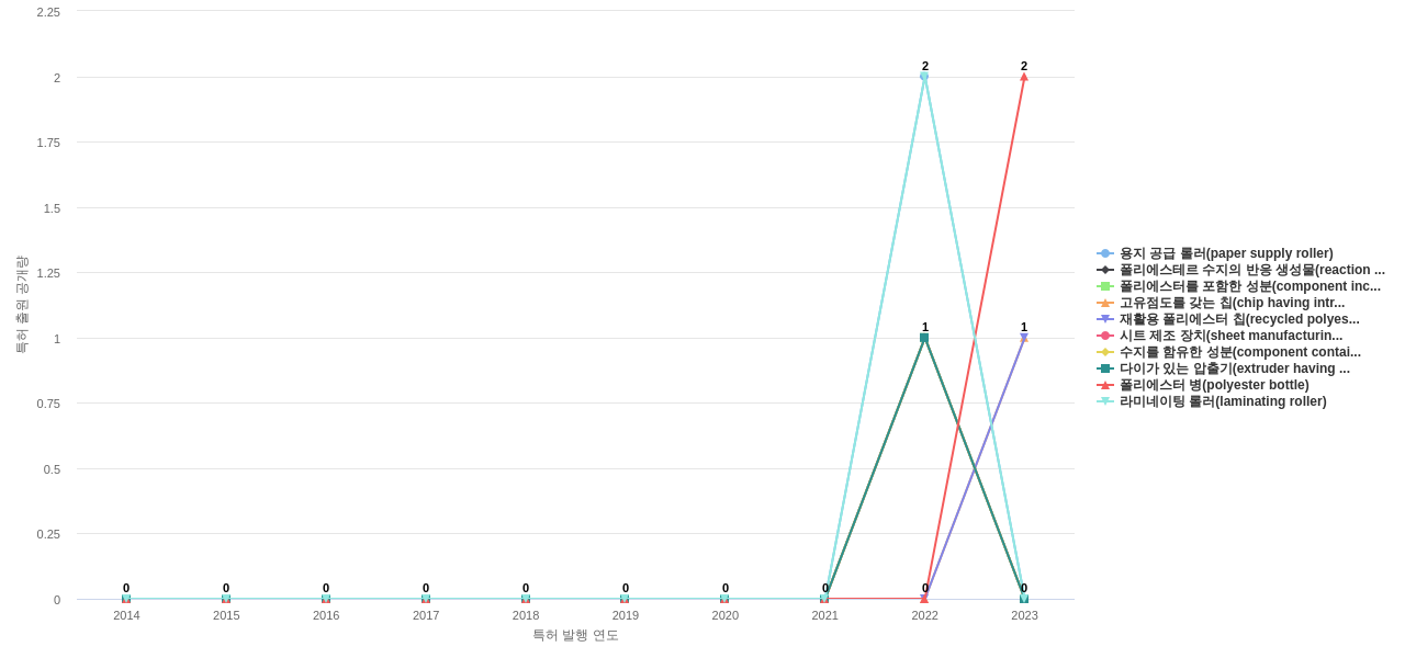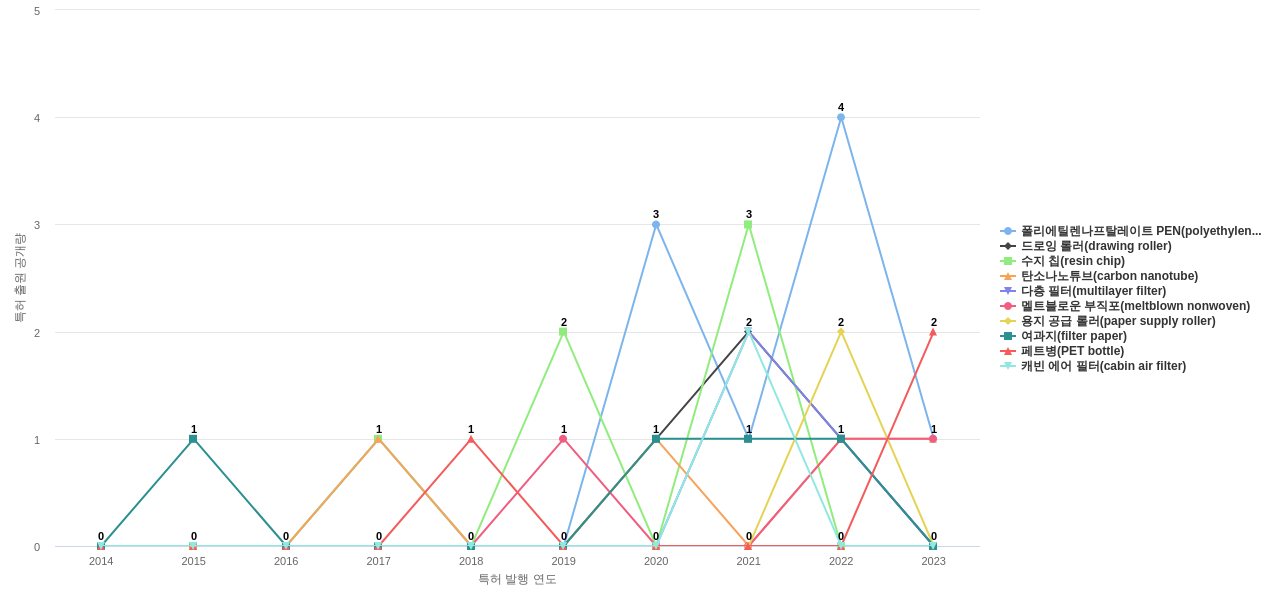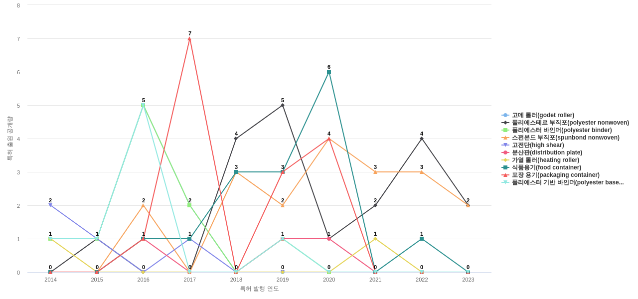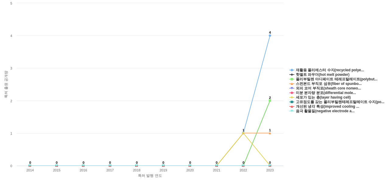 1) [기술 기획 조직]/[IP 조직] 휴비스의 특허에 포함된 신규 등장 키워드나 급성장하고 있는 키워드(제품-부품, 소재-물질, 기능-작용, 컨셉 등)를 i) 파악하고, ii) 체계적으로 테크 센싱을 수행하며, iii) 그 결과를 필요 조직에 전파해야 하지 않을까요? 특히, 고객, 주요 기업, 경쟁사, 밸류 체인이나 공급망 구성 기업인 휴비스라면 이러한 활동이 더욱 더 중요하지 않을까요?