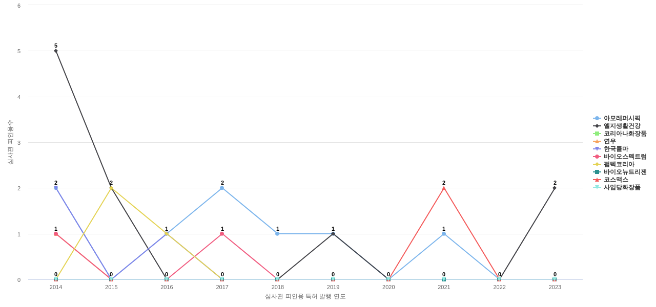 아모레퍼시픽의 심사관 피인용수는 62회입니다. 아모레퍼시픽의 심사관 피인용수는 최근 11년 이전에 54회, 최근 11년 동안에는 8회로 총 62회를 보이며, 2014년에 2회의 최고값을 보입니다. 한편, 이 값은 2022년 이래로 발생하지 않고 있습니다.