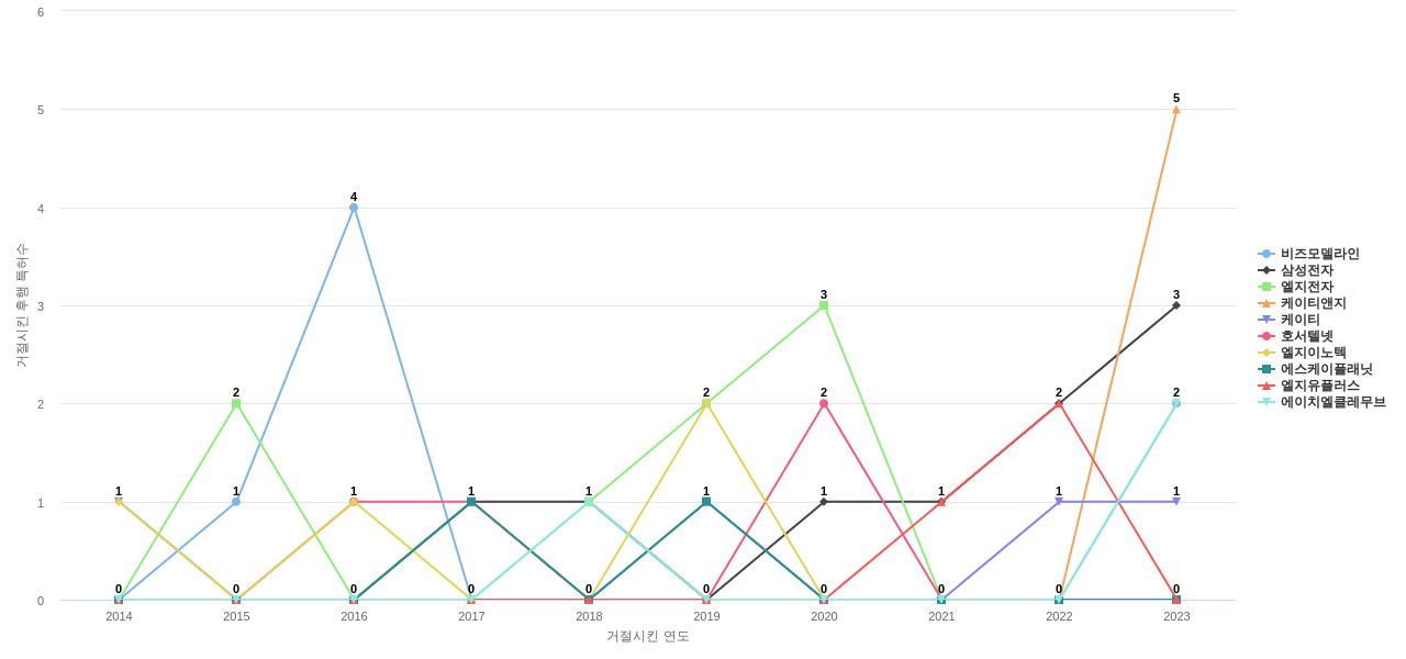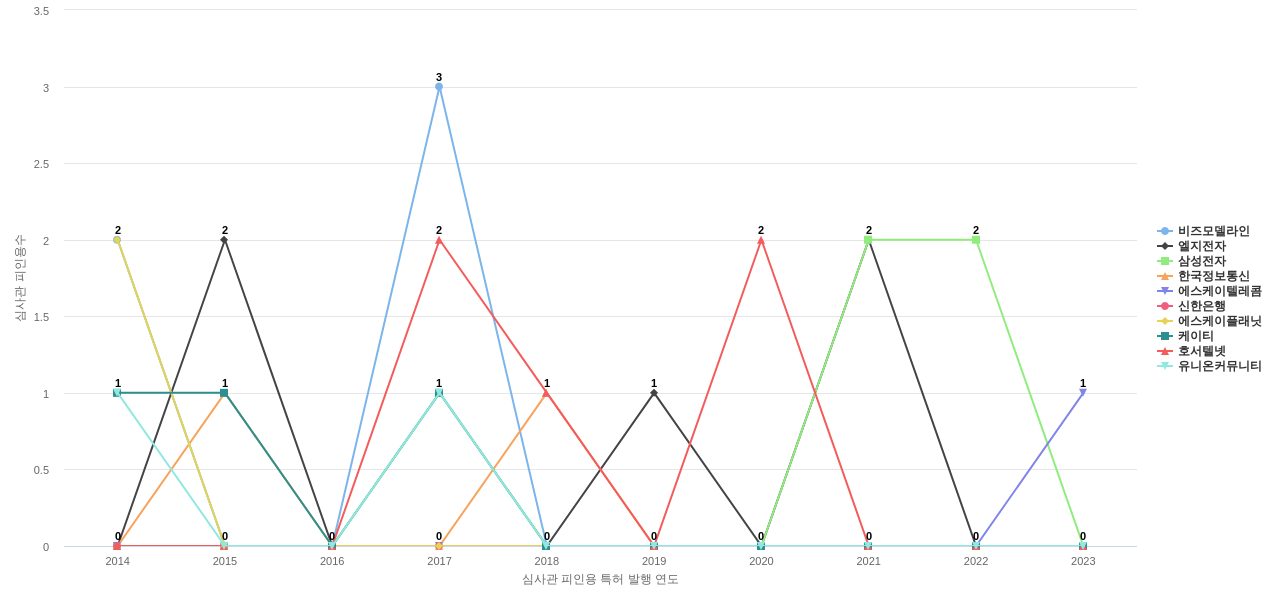 이 기업 보유 선행 특허가 받은 심사관 피인용수가 많은 관련 기업에는 1위 비즈모델라인(18회), 2위 엘지전자(18회), 3위 삼성전자(16회) 등이 있습니다.