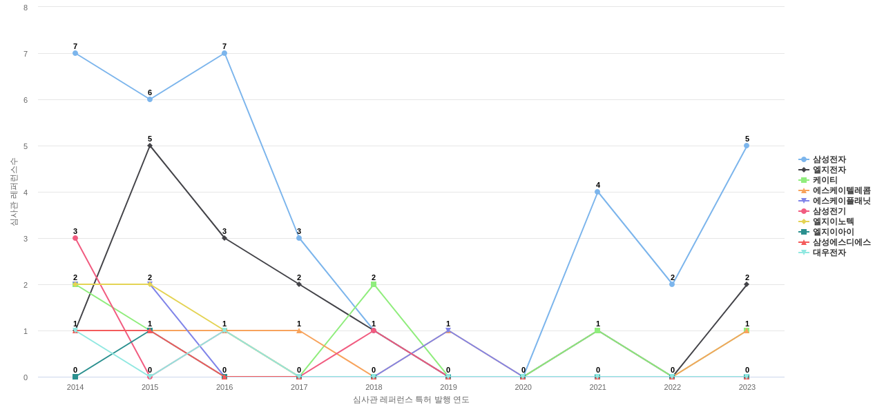 엘지전자의 심사관 피인용수는 18회입니다. 엘지전자의 심사관 피인용수는 최근 11년 이전에 13회, 최근 11년 동안에는 5회로 총 18회를 보이며, 2015년에 2회의 최고값을 보입니다. 그리고, 이 값은 이번 연도인 2024년에는 0회, 1년 전인 2023년에는 0회, 2년 전인 2022년에는 0회를 보입니다.