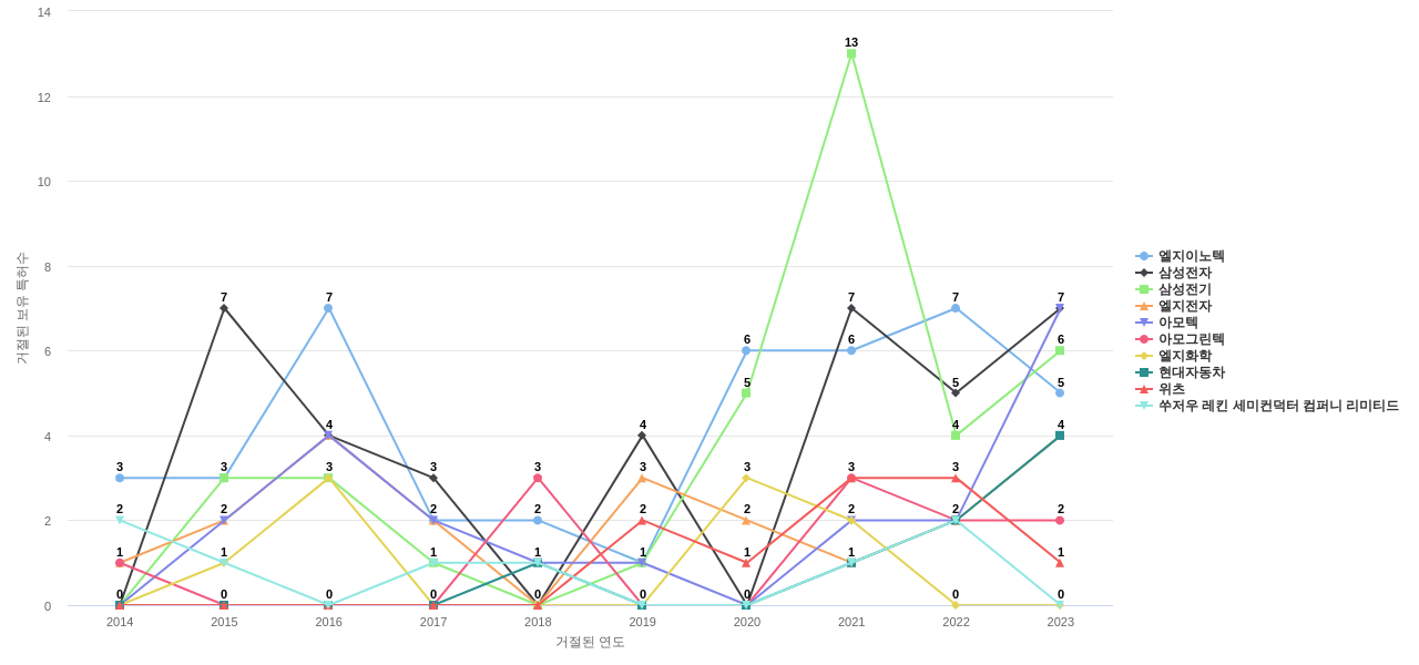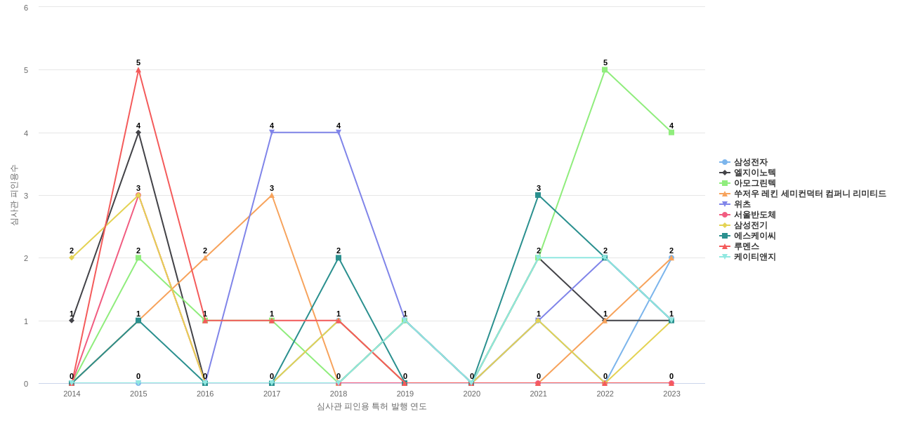 엘지이노텍의 심사관 피인용수는 18회입니다. 엘지이노텍의 심사관 피인용수는 최근 11년 이전에 8회, 최근 11년 동안에는 10회로 총 18회를 보이며, 2015년에 4회의 최고값을 보입니다. 그리고, 이 값은 이번 연도인 2024년에는 0회, 1년 전인 2023년에는 1회, 2년 전인 2022년에는 1회를 보입니다.