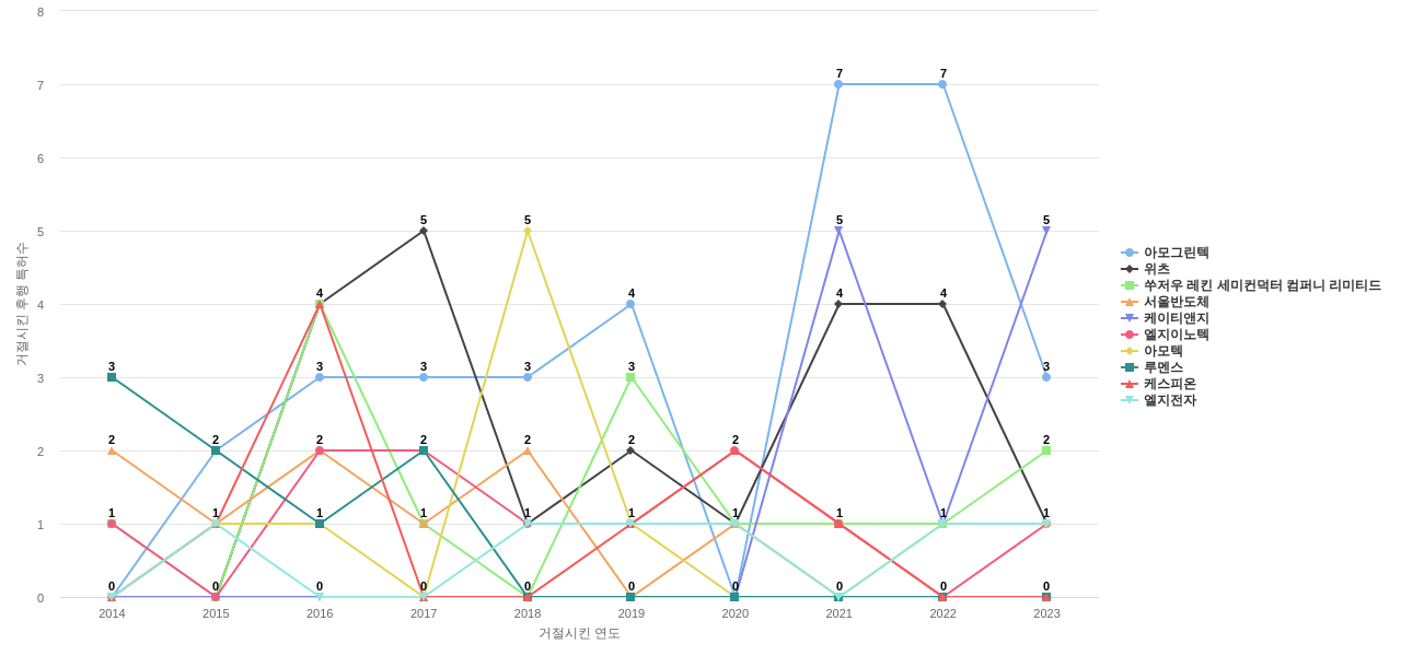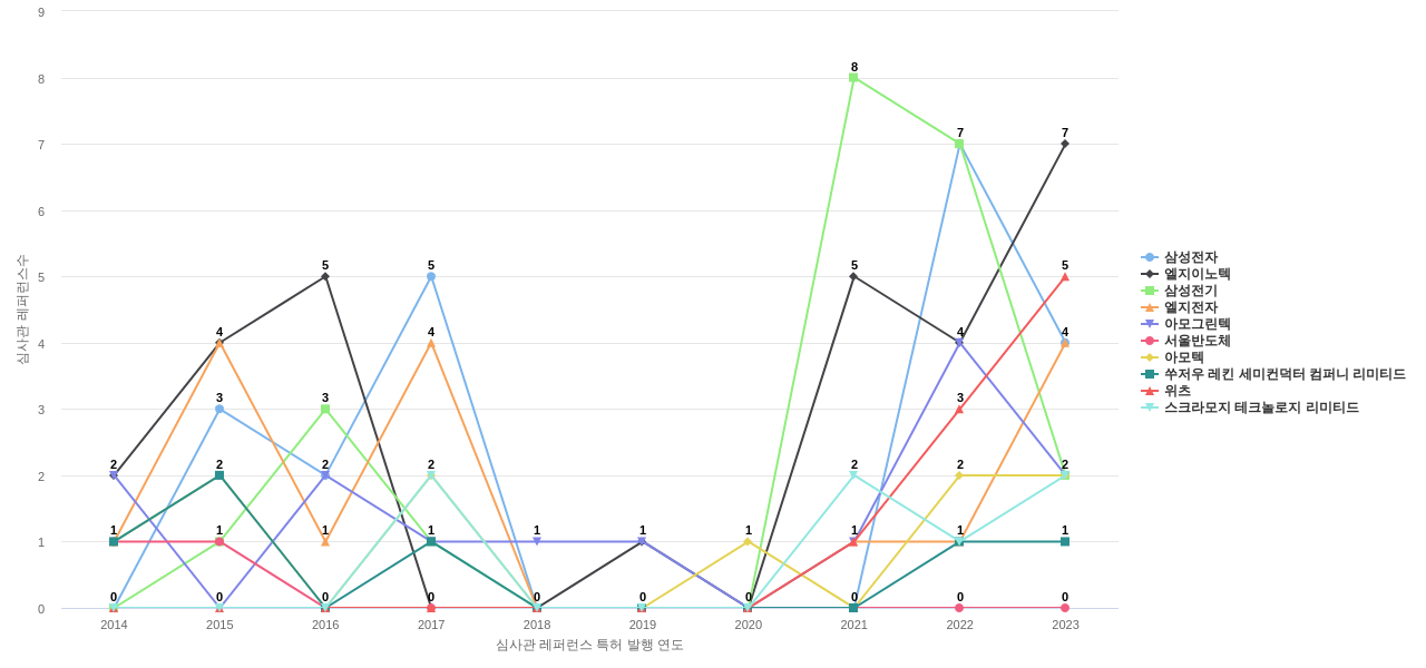 이 기업 보유 선행 특허가 받은 심사관 피인용수가 많은 관련 기업에는 1위 삼성전자(18회), 2위 엘지이노텍(18회), 3위 아모그린텍(16회) 등이 있습니다.